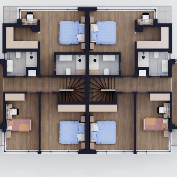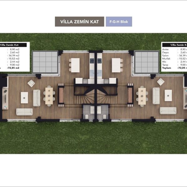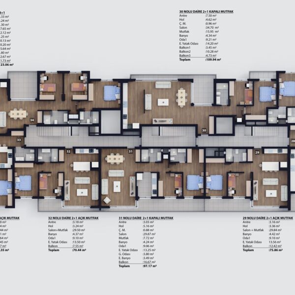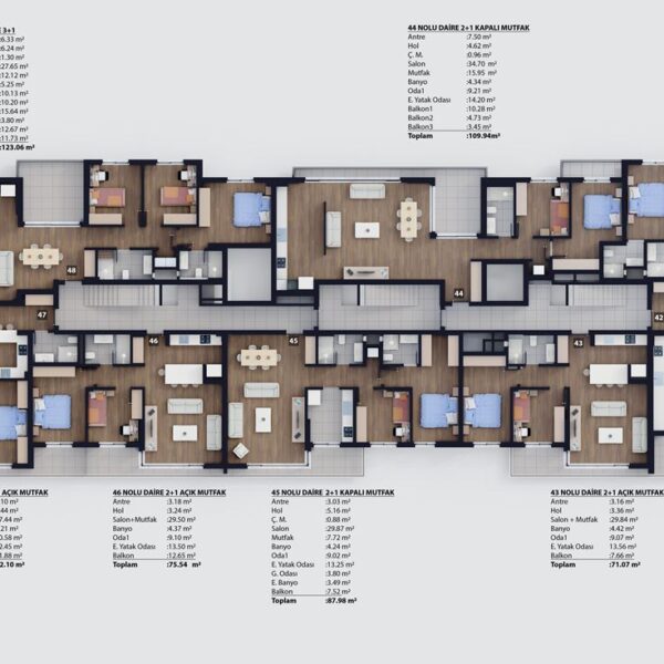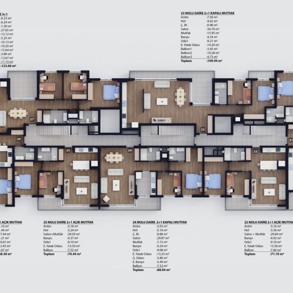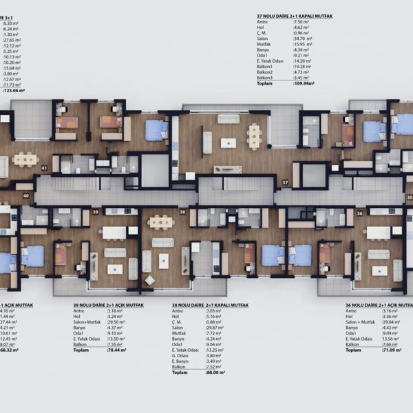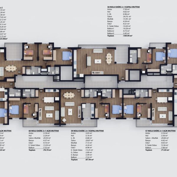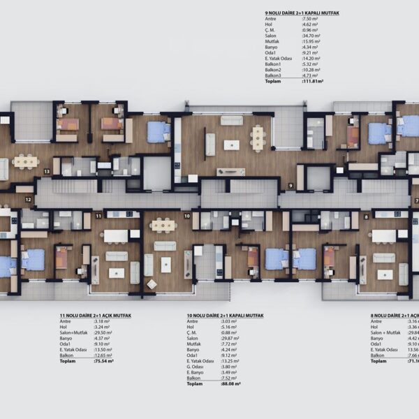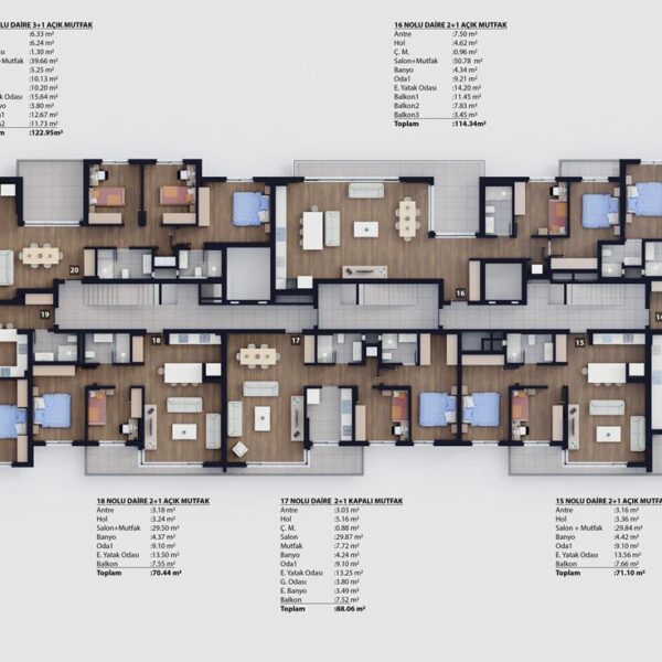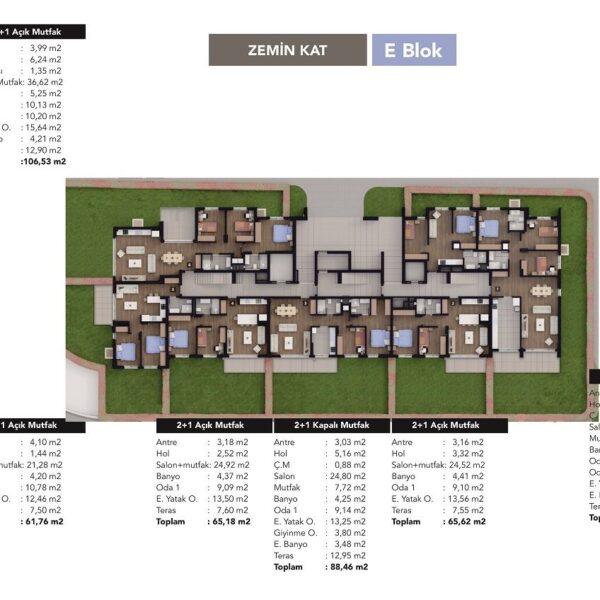 2+1 ve 3+1 açık ve kapalı mutfak tipleriyle 62 daireden oluşmaktadır.