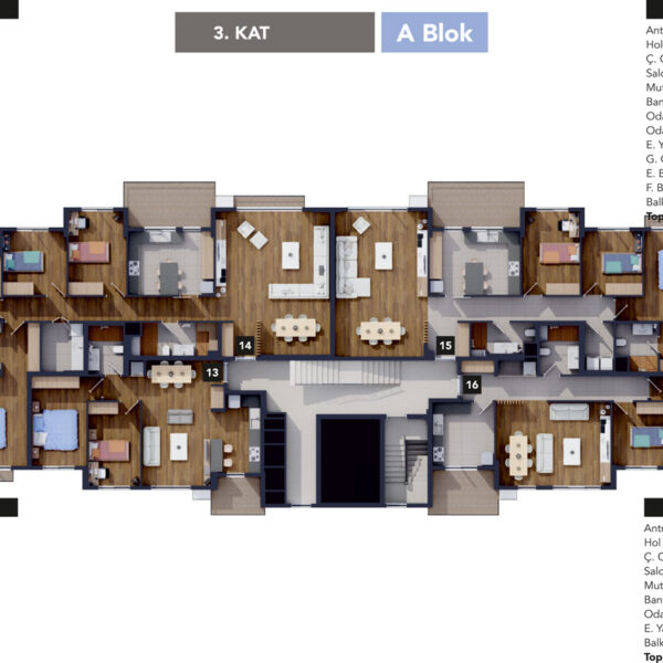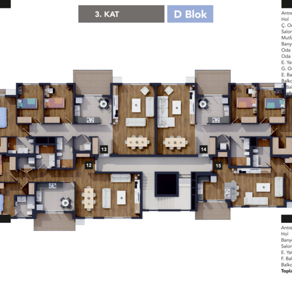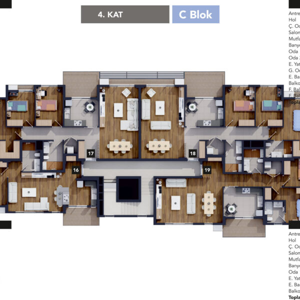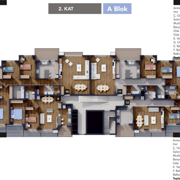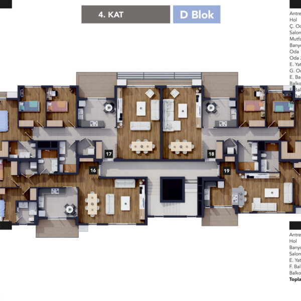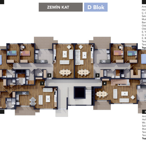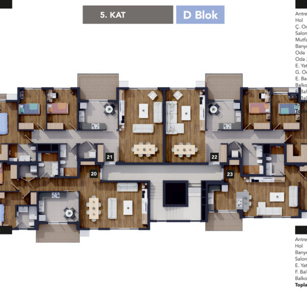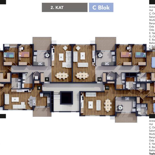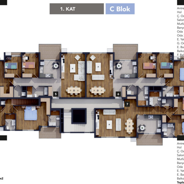 Mahal 1+1, 2+1, 3+1, 4+1 tipi dairelerden oluşmaktadır. Bu daireler de kendi içlerinde değişkenlik göstermektedir. Açık ve kapalı mutfaklı çeşitleri, büyüklük, yükseklik, bahçe katı, bahçe dubleksi, çatı dubleksi gibi detaylarda farklılaşmaktadırlar.