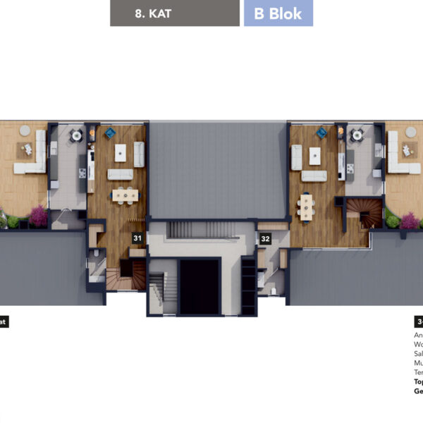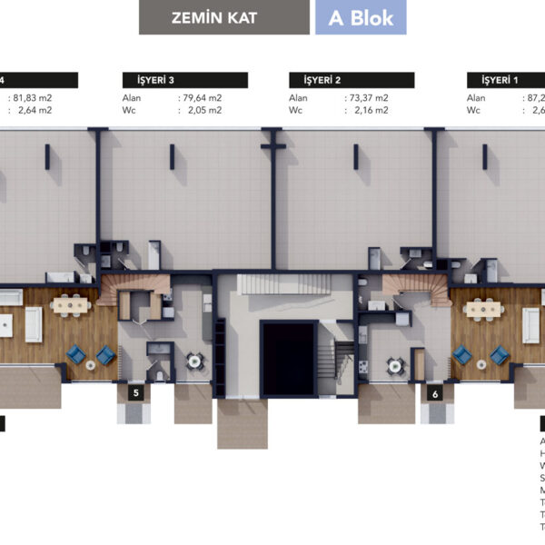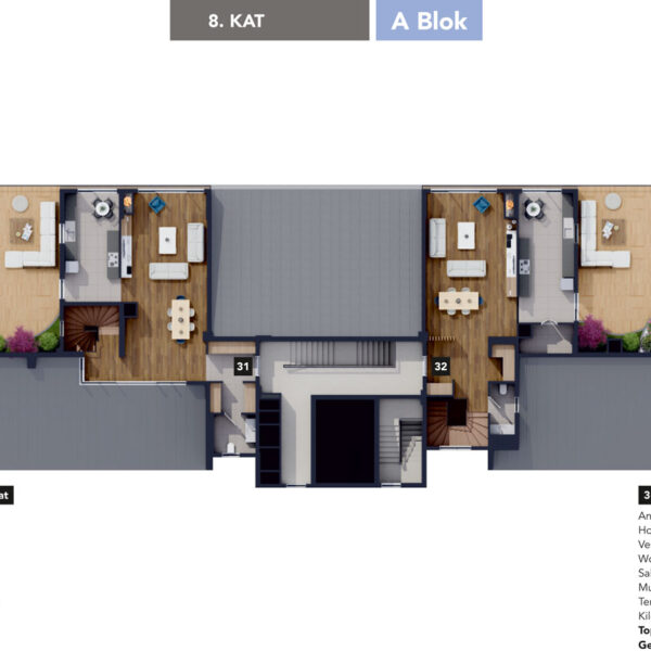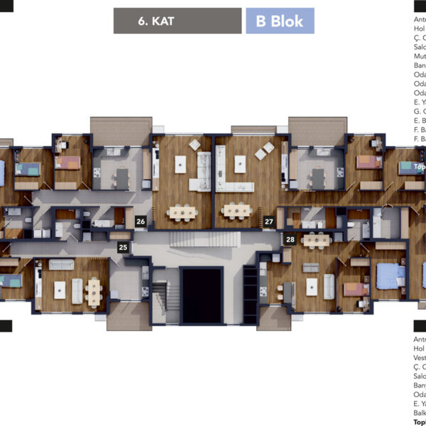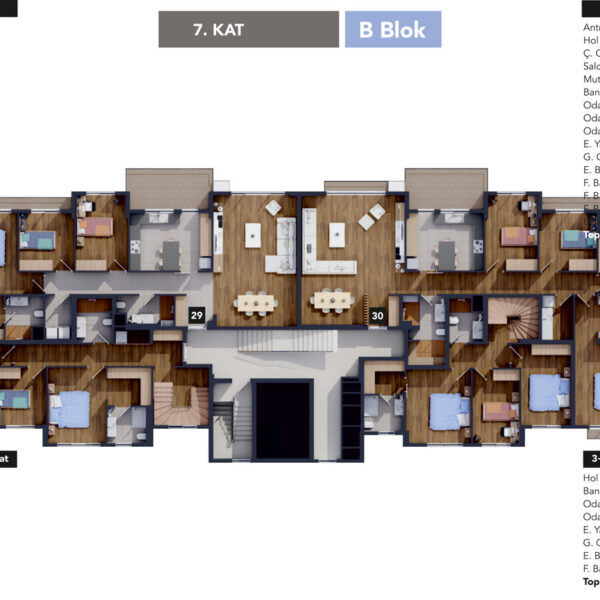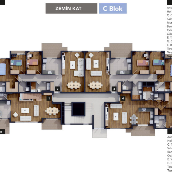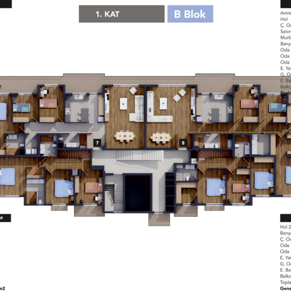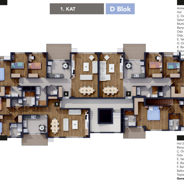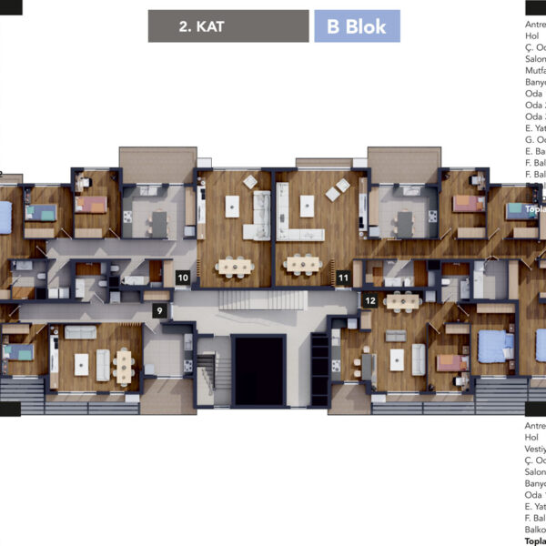 Mahal 1+1, 2+1, 3+1, 4+1 tipi dairelerden oluşmaktadır. Bu daireler de kendi içlerinde değişkenlik göstermektedir. Açık ve kapalı mutfaklı çeşitleri, büyüklük, yükseklik, bahçe katı, bahçe dubleksi, çatı dubleksi gibi detaylarda farklılaşmaktadırlar.