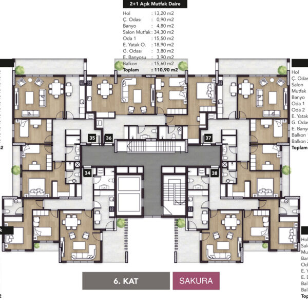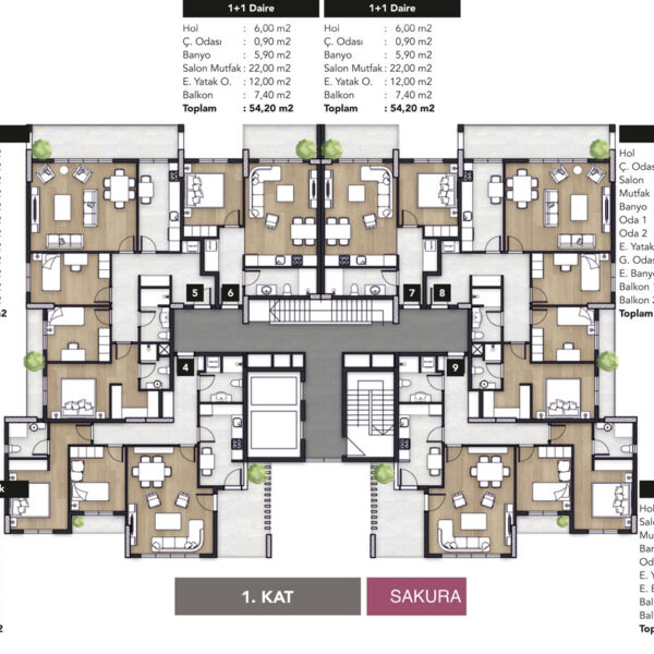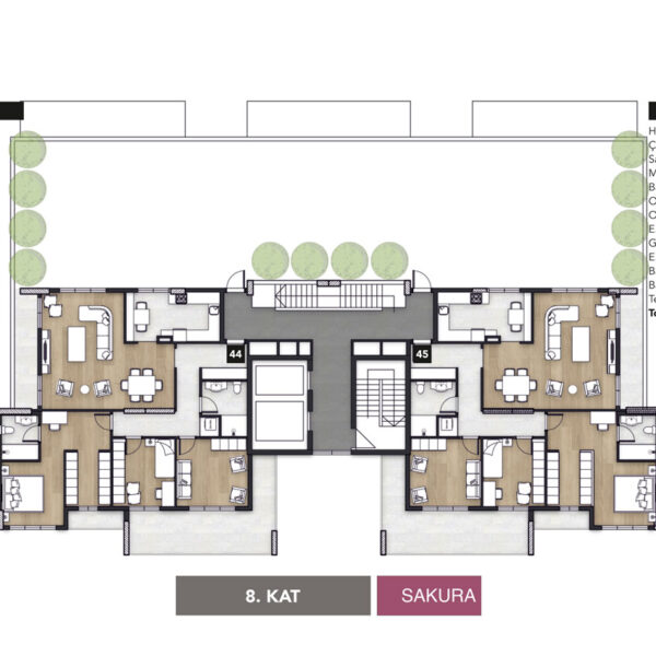 Sakura, 42 Daireden oluşmaktadır. Her katta 1+1, 2+1 ve 3+1 tipli daireler mevcuttur. Çatıda 3+1 penthouse teraslı daireler mevcuttur.